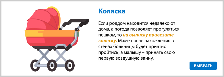 В день выписки сумки приносятся в роддом, а комплект для малыша отдается медсестре, которая одевает ребенка, пока мама готовится к выписке. Когда встречающие будут в сборе, медсестра торжественно выносит малыша уже в конверте. В помещении для выписки есть все условия для фотосессий.