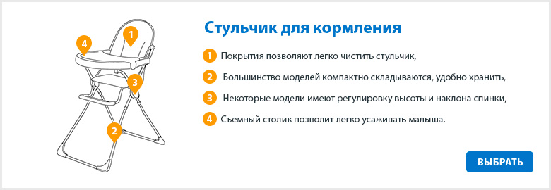 Стульчики бывают оснащены различными уровнями наклона спинки кресла, съемными столиками и лотками, карманами и подставками. Также многие стульчики имеют регулируемую высоту, чтобы малыш находился на удобном для вас уровне.