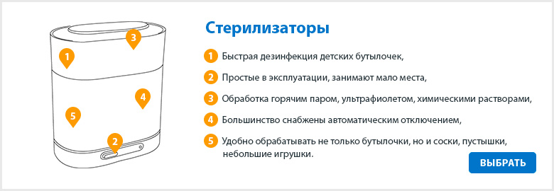 Если вы кормите из бутылочки, то в первую очередь следует приобрести стерилизатор и щетки для очистки бутылочек. Стерилизатор лучше выбрать микроволновый или паровой, они наиболее быстро и эффективно производят очистку. Также неплохо было бы купить и подставки для бутылочек, чтобы организовать их сушку. Если вы часто находитесь в дороге, обязательно купите термосумку, чтобы сохранять питание малыша нужной температуры на протяжении длительного времени.